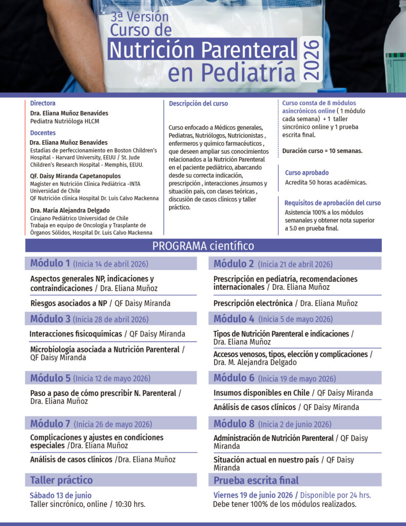 La Fundación Profesor Aníbal Ariztía y el Hospital Luis Calvo Mackenna realizará la 3ª versión del Curso de Nutrición Parenteral en Pediatría, dirigido a médicos generales, pediatras, nutriólogos, nutricionistas y químicos farmacéuticos interesados en profundizar sus conocimientos en el manejo nutricional de pacientes pediátricos.